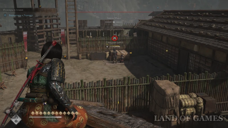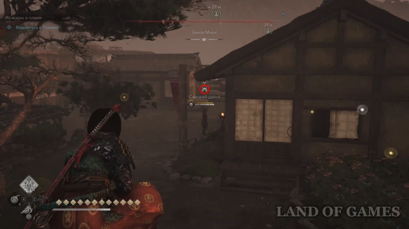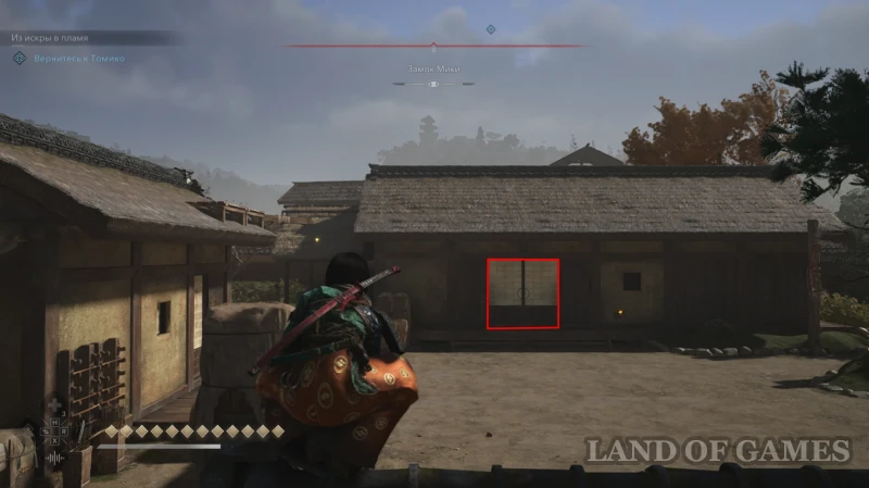 Второй самурай охраняет вход в дом с красными флагами на территории строящегося открытого пространства к северо-западу от метки замка Мики (здесь также есть вышка с колоколом).