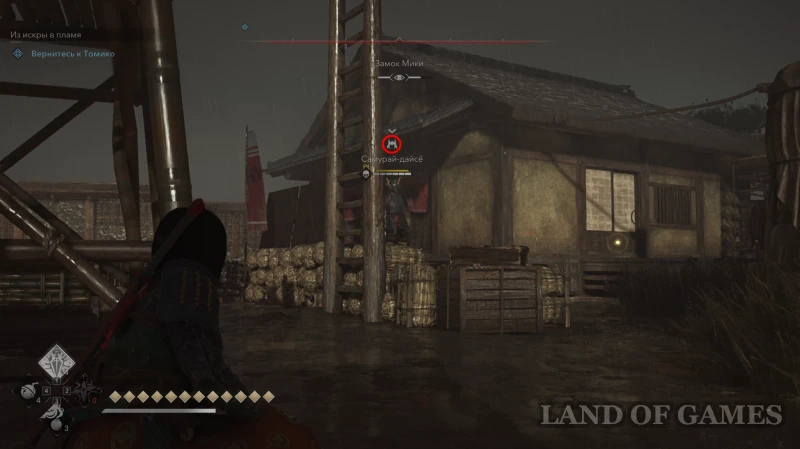 На участке, где вы сражались с третьим самураем-дайсе, есть запертая кура (сарай с ресурсами). Ключ от нее выпадет с одного из стрелков, охраняющих место для казни. Открыв и обчистив склад, вы получите: