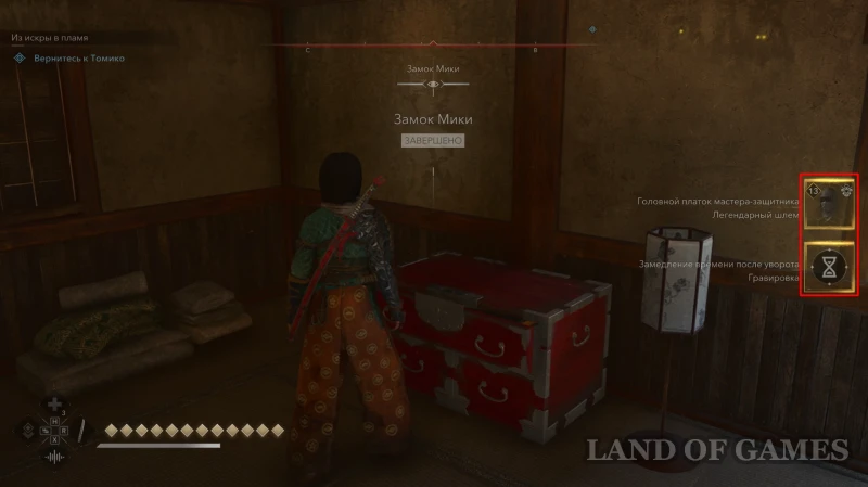 Одолев четвертого самурая и покончив с остальными целями, пройдите в одноэтажный дом по центру укрепления Мики и опустошите красный сундук с наградами. После выполнения всех поставленных задач, вам станут доступны следующие вознаграждения: