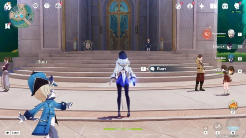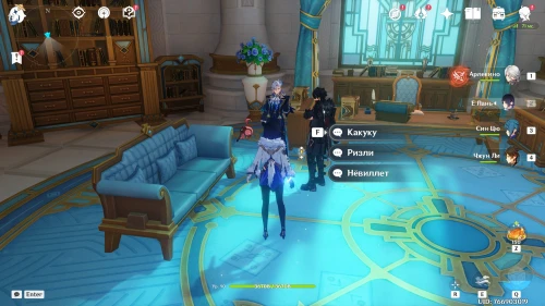 Телепортируйтесь к статуе Гидро Архонта возле Дворца Мермония и войдите внутрь. Бегите вперед в основной зал, а затем сверните вправо в кабинет Невиллета. Здесь вы обнаружите Невиллета, Какуку и Ризли, которые будут говорить о Натлане и заврианах.