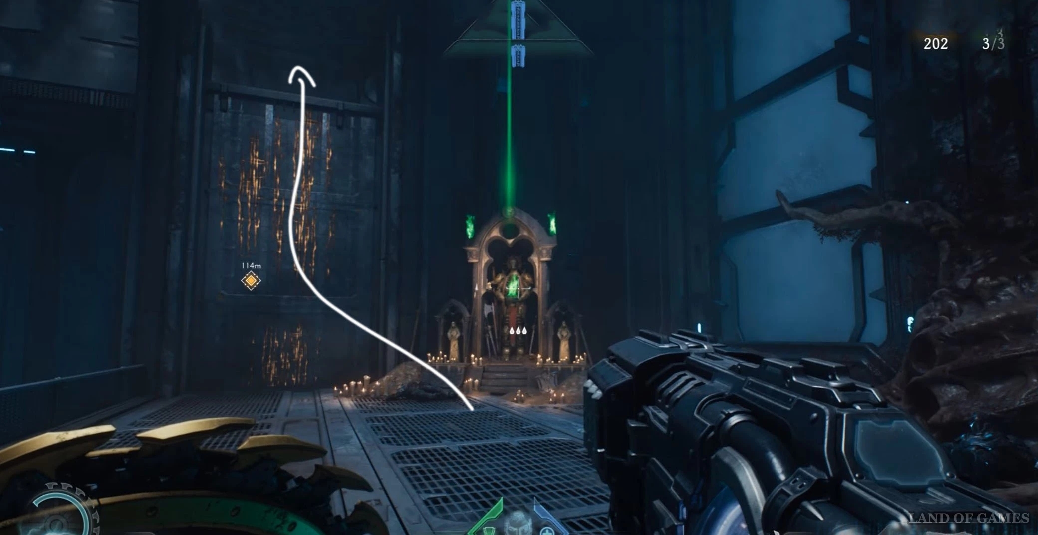 Получив Щит-пилу, с помощью которого можно разрезать цепи на дверях, киньте его в первую запертую дверь впереди, чтобы открыть. Затем сразу же поверните камеру влево, и вы увидите вторую закрытую дверь с замком – выбейте и ее тоже. Войдите в секретное помещение, разберитесь с культистами и заберите зеленый шлем в конце коридора.