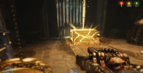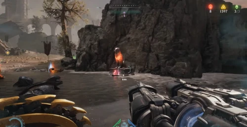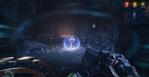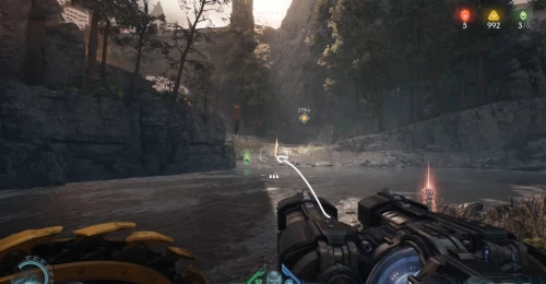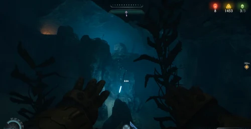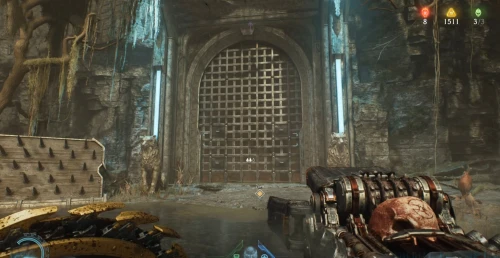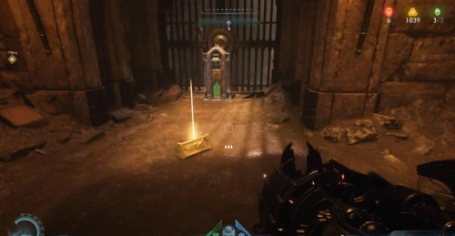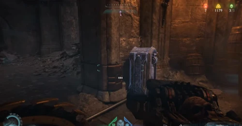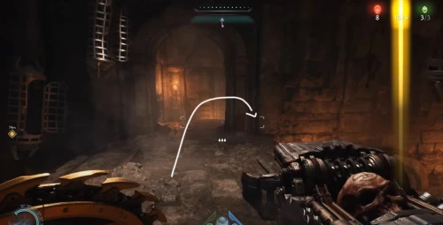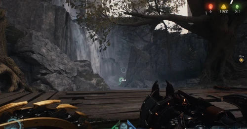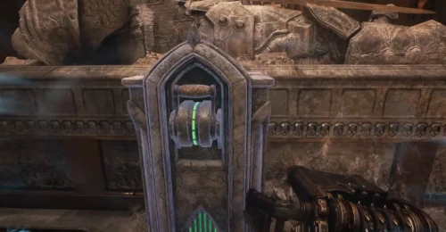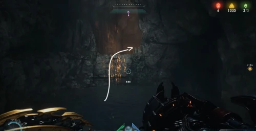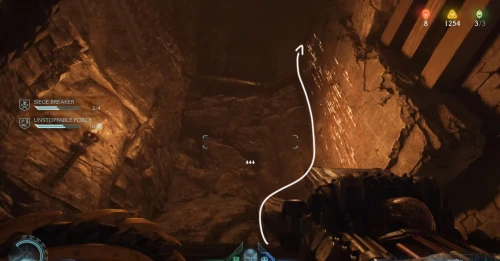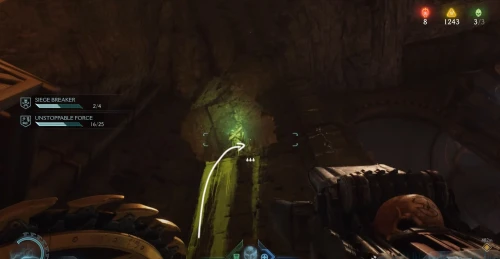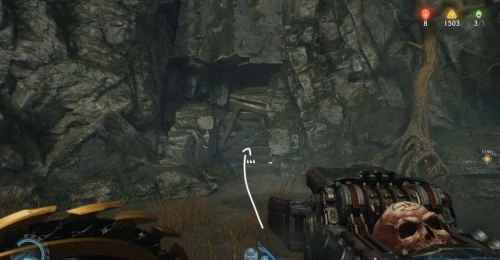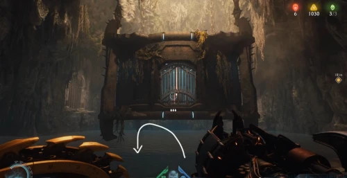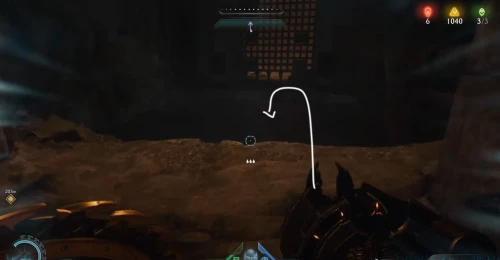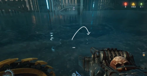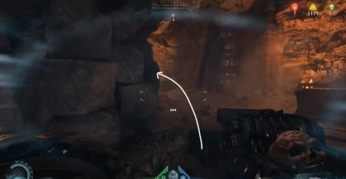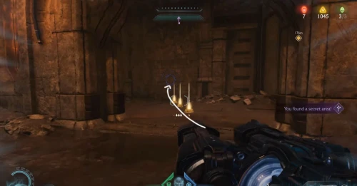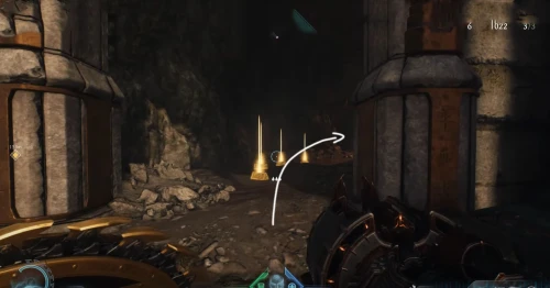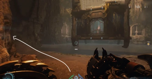 Двигайтесь на юго-восток от уничтоженного орудия, и вы обнаружите здесь небольшой водоем с решетчатой конструкцией – подойдите к двум синим лампам чуть впереди от нее. Здесь вы найдете скрытый пролом. Погрузитесь в воду и плывите через подводную пещеру на другую сторону, а затем всплывите для попадания в секретную зону с золотым сундучком.