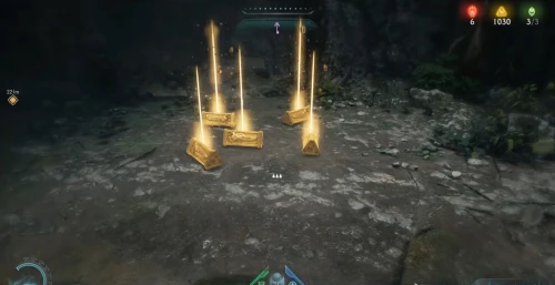 При этом вы опустите площадку и откроете решетку перед собой – пройдите вперед, подобрав 3 золота. Затем поверните камеру направо и взберитесь наверх по ящику и стене. Сразу же сверните влево и разрушьте деревянную преграду щитом. В туннели вы найдете еще 8 слитков. Развернитесь, возвратитесь назад и выберитесь из пещеры, двигаясь по следу из частичек брони. Далее начните подбирать слитки, лежащие на земле.