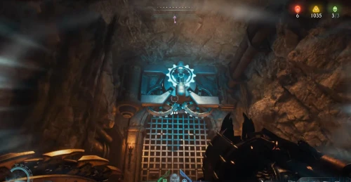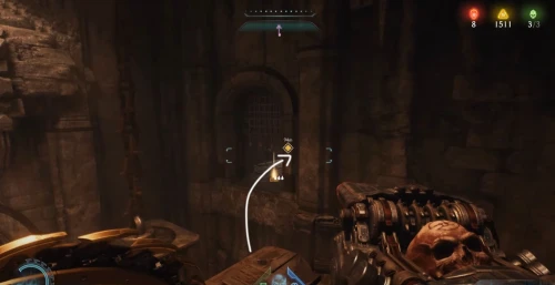 Развернитесь и разрушьте стену с помощью щита для нахождения 8 слитков в секретной зоне. Затем возвратитесь в предыдущее помещение и бросьте щит в цепь рядом с решеткой, чтобы поднять ее. Пройдите вперед, встаньте на очередную кнопку и уничтожьте вторую мишень возле синего барьера.