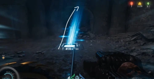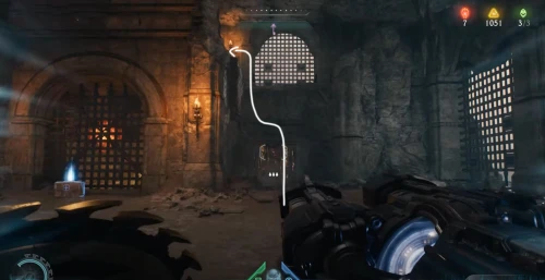 Пока что не взаимодействуйте с кнопкой на полу впереди, а вместо этого сразу же сверните влево и пройдите в небольшую комнату. Здесь поверните камеру наверх и вправо, чтобы увидеть синий переключатель над решеткой – киньте в него щит и пройдите в открывшийся проход.