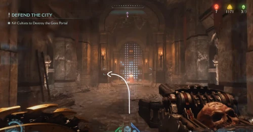 Пройдите в южном направлении от уничтоженного ранее артиллерийского орудия, чтобы попасть в область, где расположен 3-й кровавый портал. Пройдите в здание, разберитесь с рыцарями ада в помещении с красными бочками и войдите в открывшийся синий телепорт.