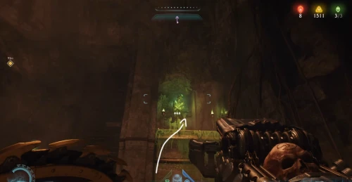 Забрав самоцвет, развернитесь и поверните направо, чтобы подобрать 5 слитков, поднимаясь вдоль стены. Дойдя до тупика, поднимите камеру вверх, и вы заметите зеленую статую – киньте в нее щит, а потом взаимодействуйте с ней, чтобы подпрыгнуть и оказаться на верхней площадке. Потом поверните направо и подойдите к краю выступа. Вы заметите на круглой платформе впереди еще 8 слитков. Спрыгните туда и заберите сокровище.