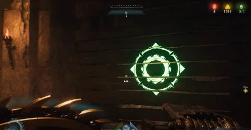 Вновь войдите в комнату с барьером и двигайтесь вперед в следующую зону, используя в качестве ориентира красную полоску на полу. Далее поверните в комнату справа, обернитесь и взаимодействуйте с переключателем для активации трамплина в предыдущем помещении. Прыгните на нем на площадку выше, а потом заверните за угол, подберите печать жизни и встаньте на новую кнопку, чтобы убрать защиту с третьей красной мишени, – подбейте ее щитом.