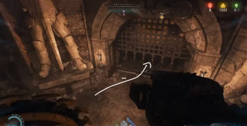 Возвратитесь назад к мосту и теперь прыгните вперед, взобравшись наверх по стенке. Пройдите дальше и взаимодействуйте с рычагом для открытия ворот. Спрыгните на нижний уровень, сверните вправо и пройдите через открывшийся проход для нахождения золотого сундучка.