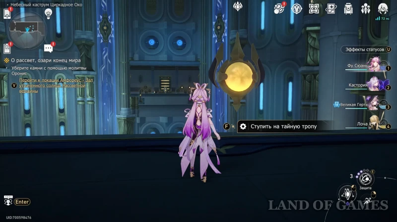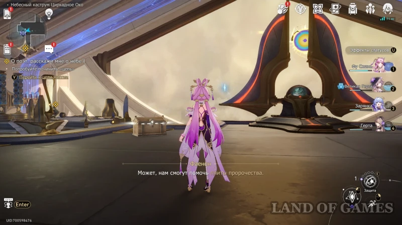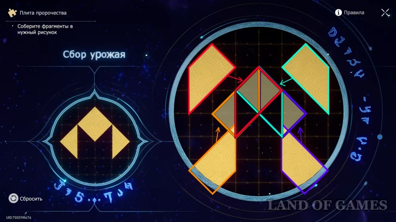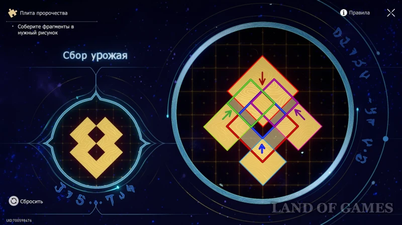 От предыдущего места спуститесь на уровень ниже (на балконе есть стела Тайной тропы) и пройдите по воздушной платформе (ее нужно будет притянуть силой времени) к Плите пророчества. Чтобы получить трофей, решите головоломку «Сбор урожая», как это показано на скрине выше.
