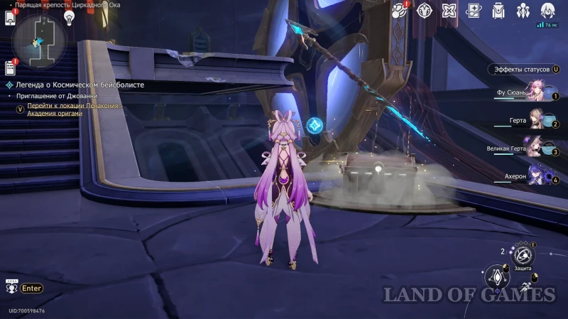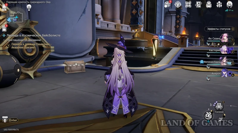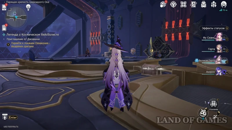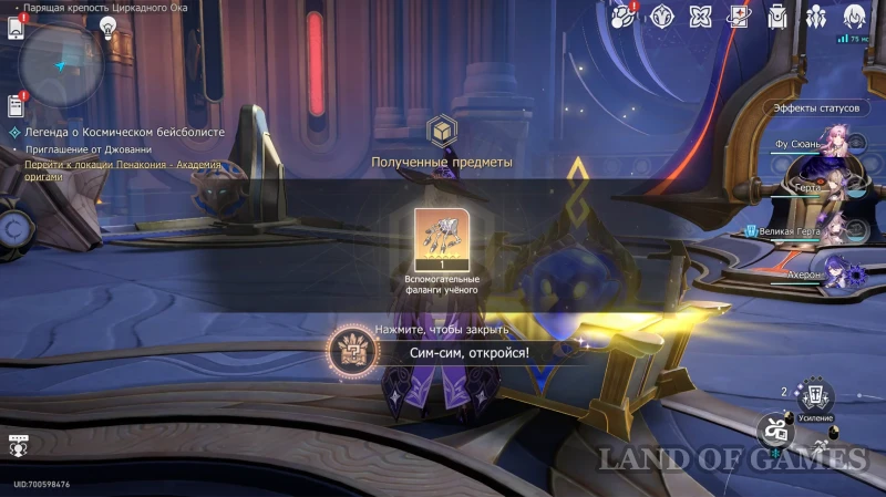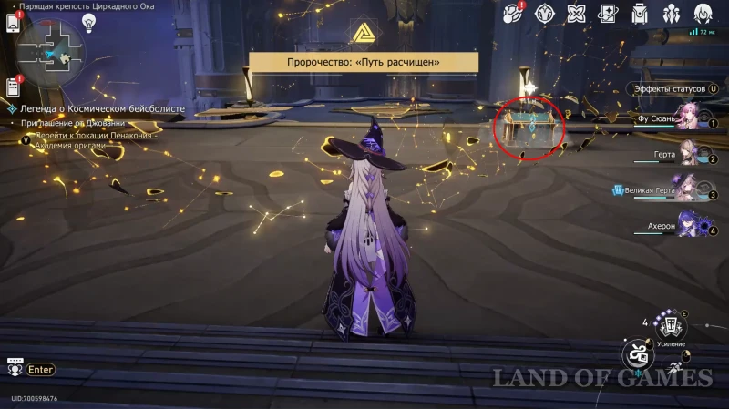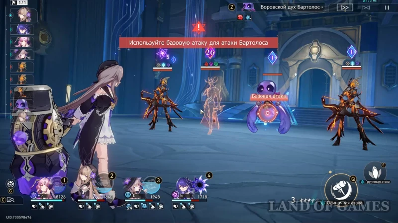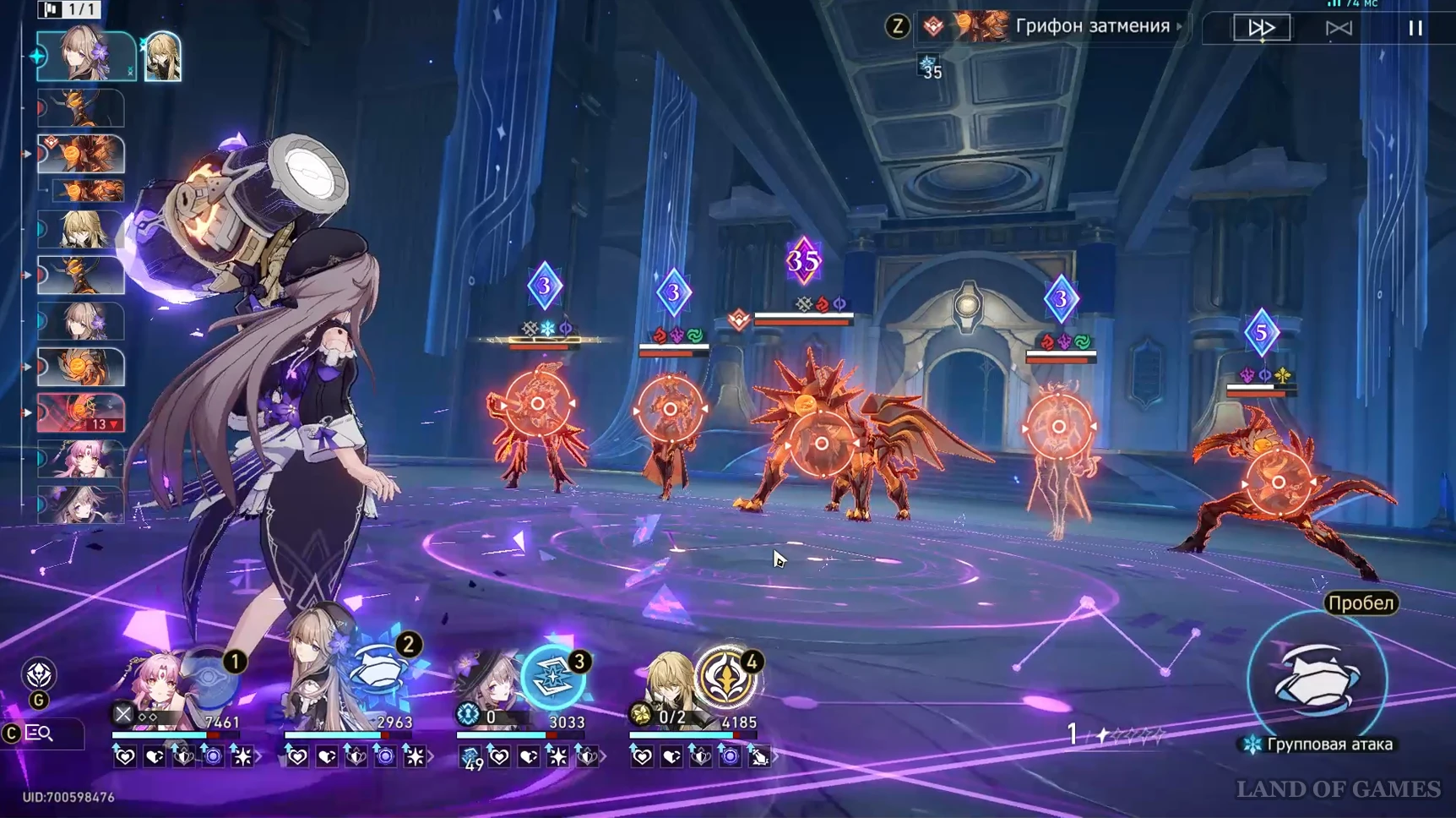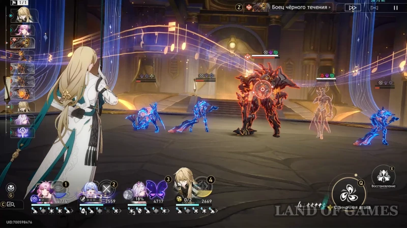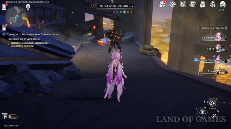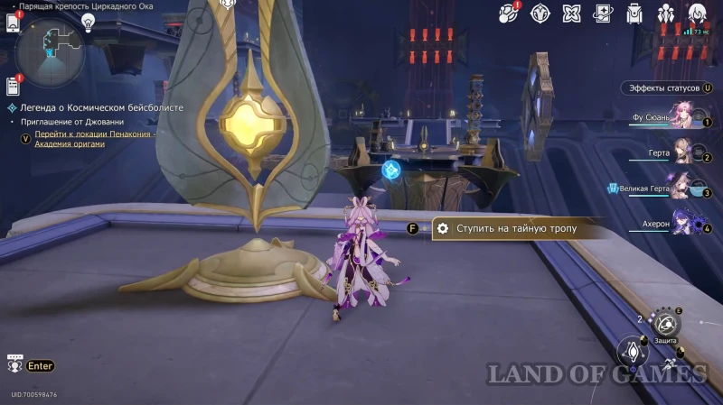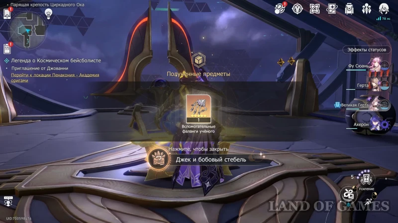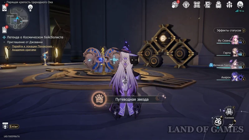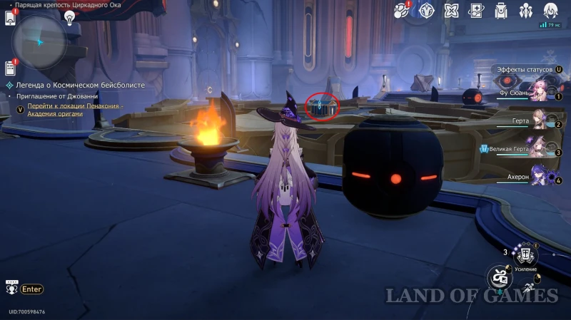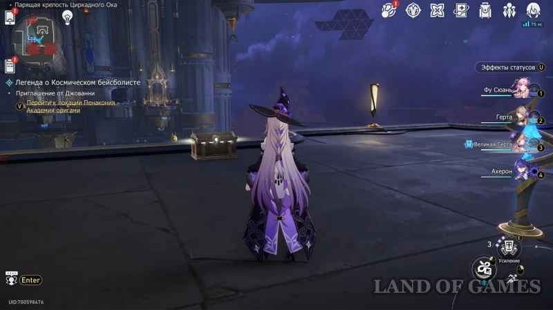 Попадите на участок с якорем «Костяк ночи» на западе карты (сюда можно переместиться по стеле Тайной тропы, находящейся левее стартового телепорта). Далее спуститесь на юг и вступите в битву с сильным противником. Вам будет легче победить, если в команде будут герои физического, огненного или квантового элементов (это уязвимости главного врага, остальные видно на третьем скриншоте выше).