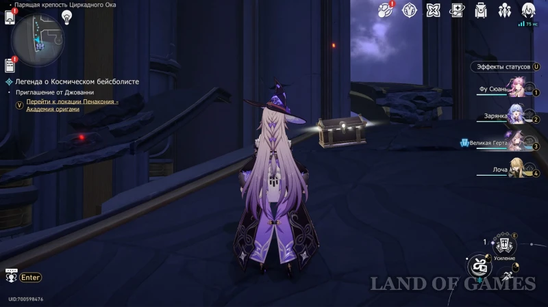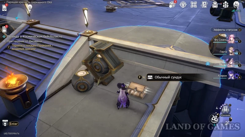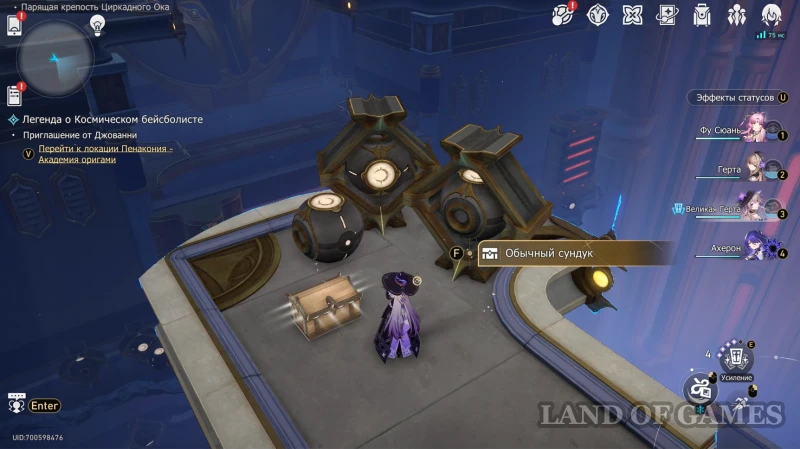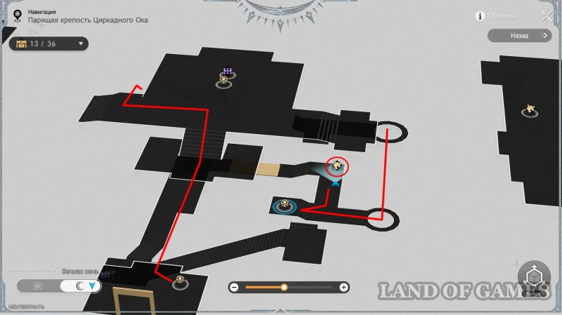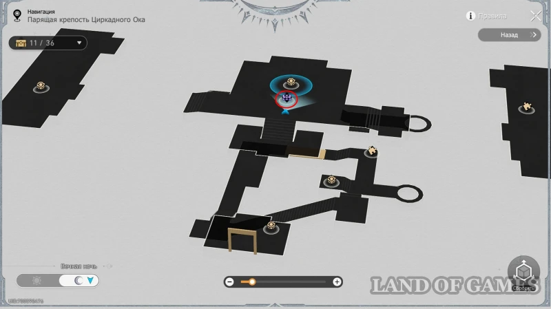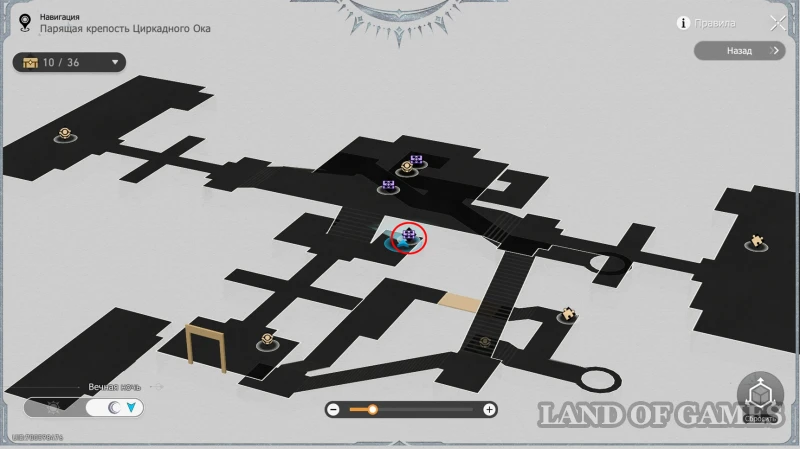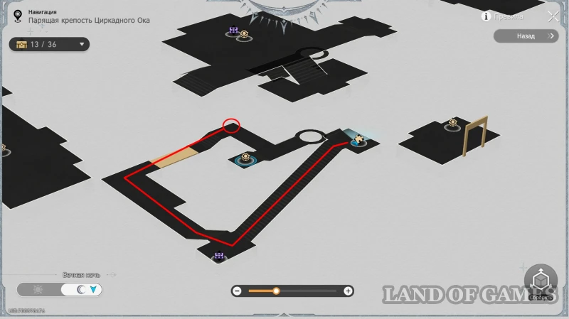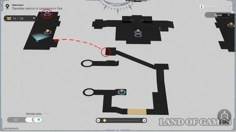 Поиск сокровищ в разрушенной Парящей крепости предлагаем начать со стартового якоря на юге карты («Руины слез ночи»). Первый сундучок стоит справа от телепорта, на площадке со стелой Тайной тропы.