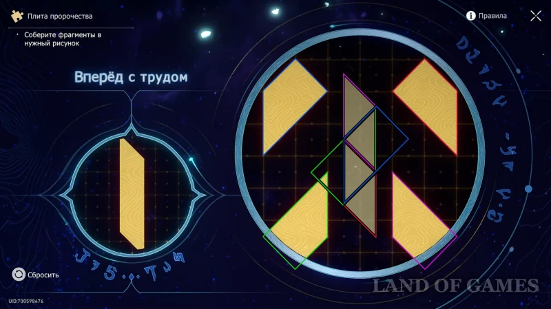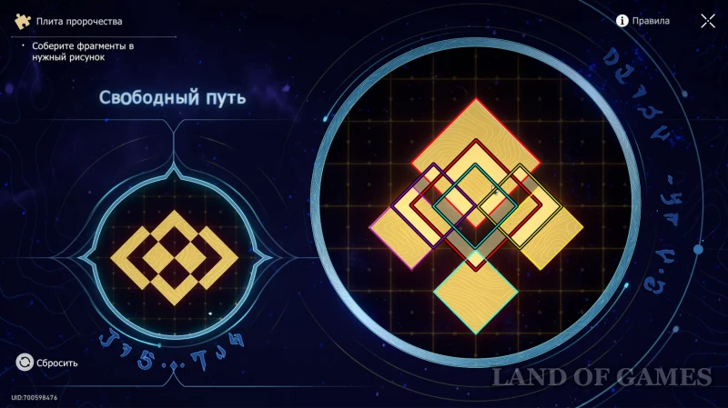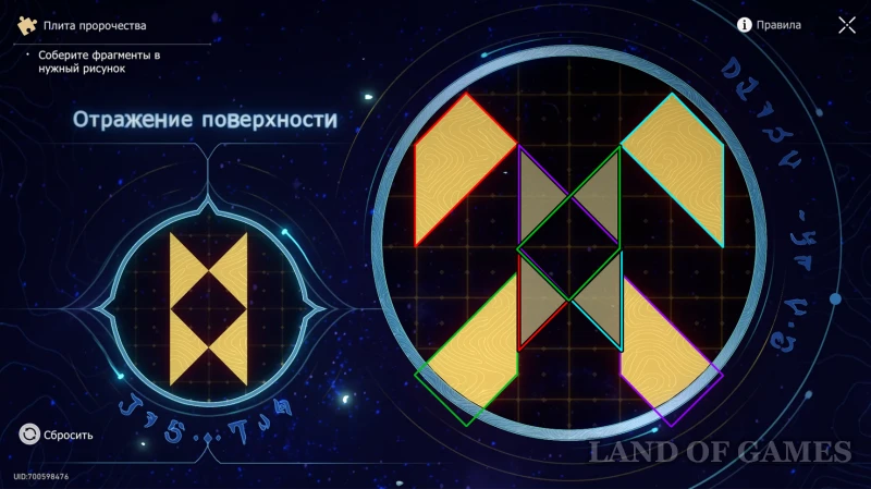 На том же участке, где стоит прошлый сундук, есть Плита пророчества «Отражение поверхности». Собрав на ней картинку с подсказки (правильное расположение есть сверху, на третьем скриншоте), вы проявите часть моста впереди, а вместе с этим — один ценный ларец.