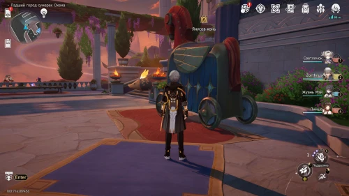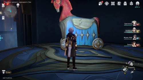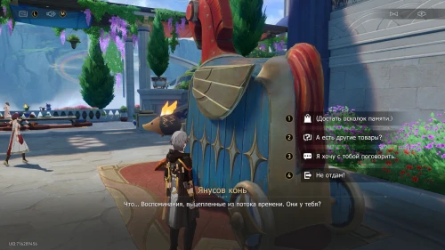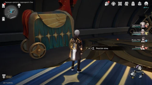 Только на страже самой себя – Исследуйте двух янусовых коней в небесном каструме Циркадное Око и в Парящей крепости Циркадного Ока. Переместитесь к якорю «Платформа золотой купели», а затем начните двигаться на северо-запад, бегая по платформам. В указанном нами месте вы обнаружите янусова коня. Взаимодействуйте с ним и выберите ответы «Залезть в брюхо деревянной лошади»