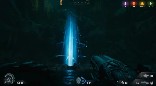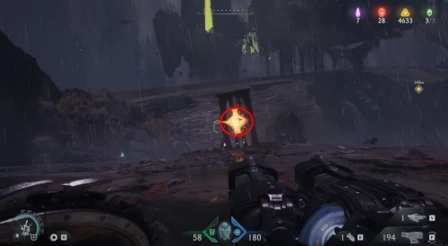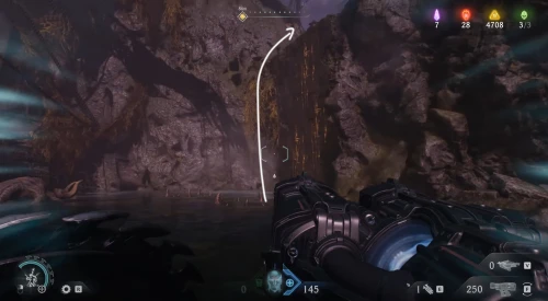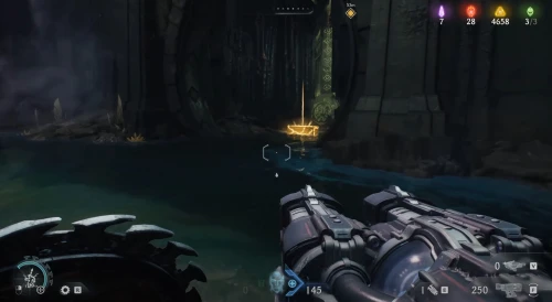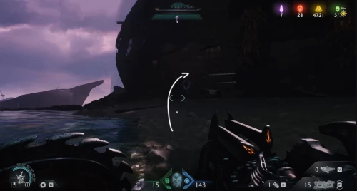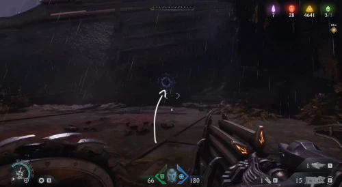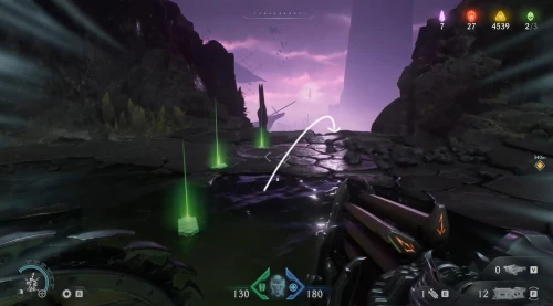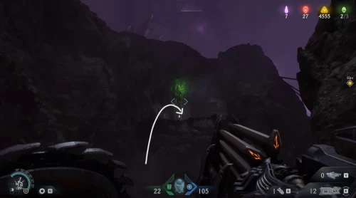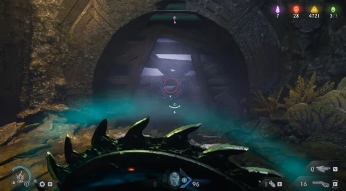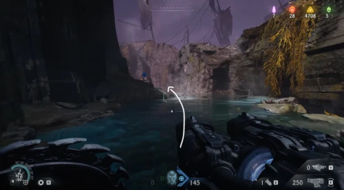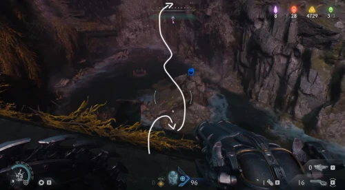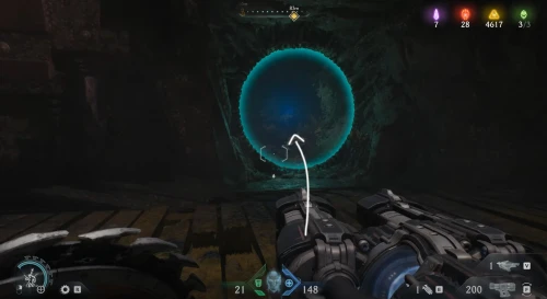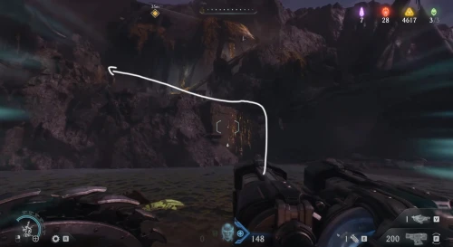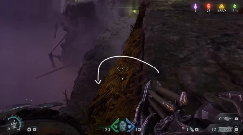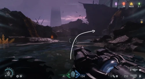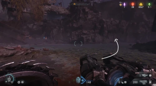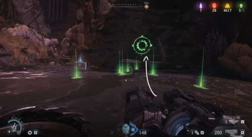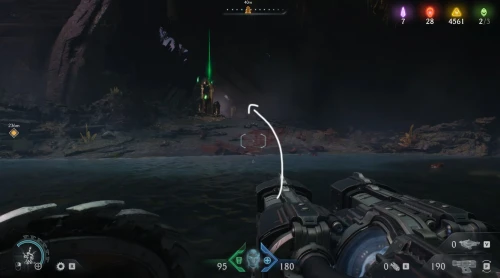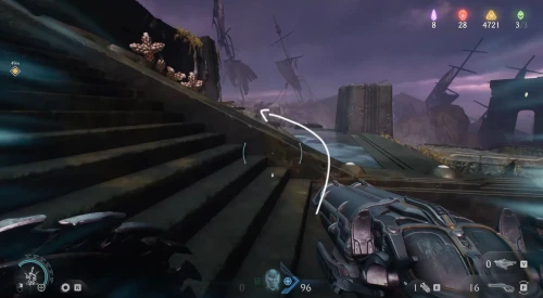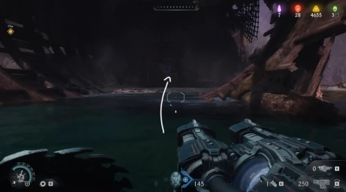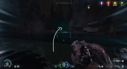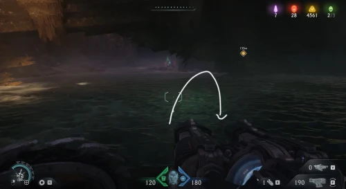 Воспользовавшись вторым огромным зеленым порталом и пройдя этап с плаванием, вы окажетесь в новой локации. Расправьтесь со всеми противниками здесь, а потом начните идти налево и пройдите через водяное кольцо. Спрыгнув вниз, уничтожьте щупальце, а затем используйте трамплин, дабы снова оказаться в воде. Плывите вперед, и вы обнаружите скин для оружия.