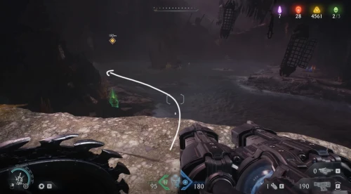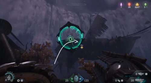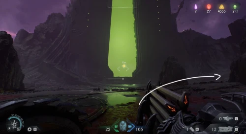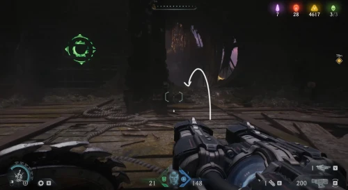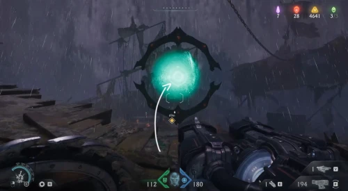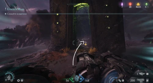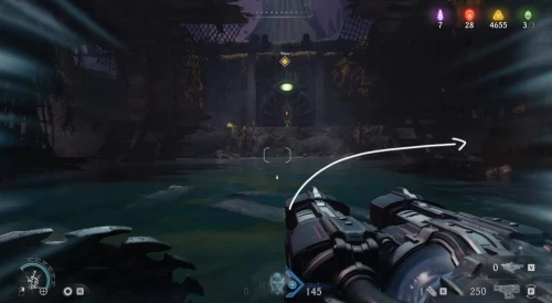 Продолжайте следовать за квестовым маркером, пока не доберетесь до огромного зеленого портала, возле которого необходимо расправиться с противниками. Пока что не входите в него – вместо этого поверните вправо и заберитесь на небольшой выступ. Пройдите немного вперед и поднимите камеру вверх, чтобы увидеть зеленую статую – киньте в нее щит и запрыгните на выступ. Соберите слитки, а потом заберите самоцвет.