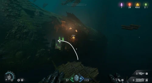 Взяв драгоценный камень, пройдите через зеленый портал и продолжите следовать за квестовым указателем, плывя вперед к затонувшему кораблю. Заплывите в его пробоину и двигайтесь к отверстию с другой стороны, но пока не проплывайте через него, – вместо этого поверните направо и проплывите немного наверх. Вы обнаружите скрытую зону со страничкой кодекса.
