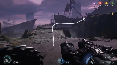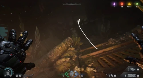 Вновь войдите в корабль и пройдите направо. Перепрыгните через разлом и разломайте деревянную преграду справа, чтобы выйти наружу. Снова поверните вправо, обойдя камень, и прямо за ним вы обнаружите слитки.