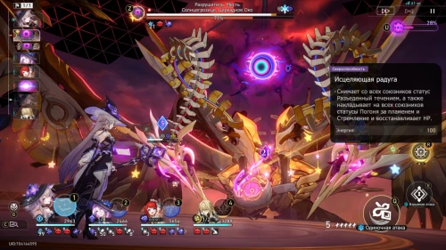 Речь идет об особом умении в третьей фазе сражения. Вы можете накопить два заряда Исцеляющей радуги и использовать ее, чтобы снять статус Разъеденный течением. Не стоит применять это умение сразу после того, как оно зарядится — лучше сохраните его на экстренный случай, когда кто-то из членов отряда получит вышеупомянутый статус или лечения от вашего хилера окажется недостаточно. Учитывайте, что статус Разъеденный течением можно снять только с помощью Исцеляющей радуги.