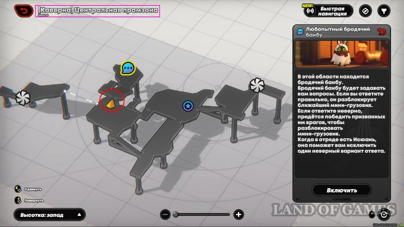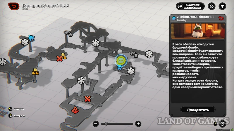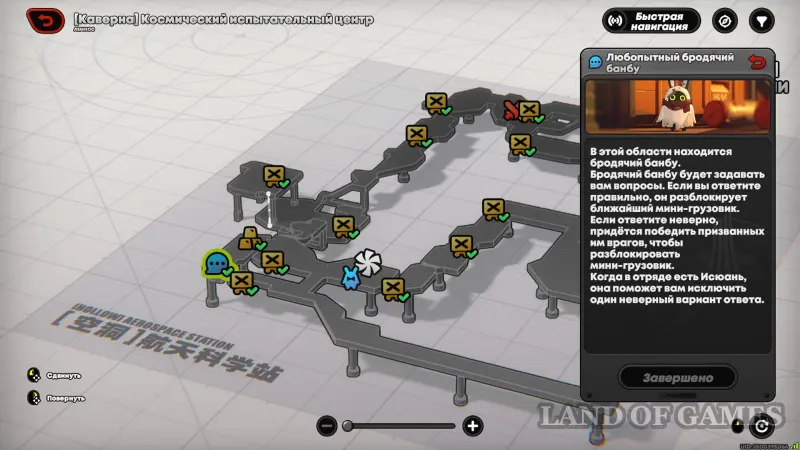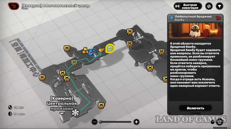 Бродячего банбу также можно повстречать в каверне «Космический испытательный центр» (карта откроется по миссии «[Возрождение храма] Знакомство с люмикерамитом 3», выдаваемой Фасолькой после 30-го уровня храма Суйбянь). Доберитесь до телепорта «Испытательный центр – внутри», затем подойдите к ограждению из алых кристаллов и примените на них Распад («Отслеживания» на «R», затем уничтожение малых кристаллов с обратной стороны на «F»).