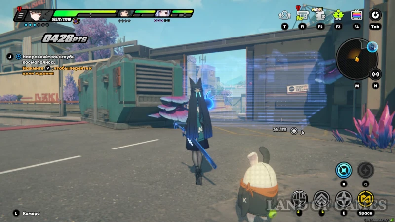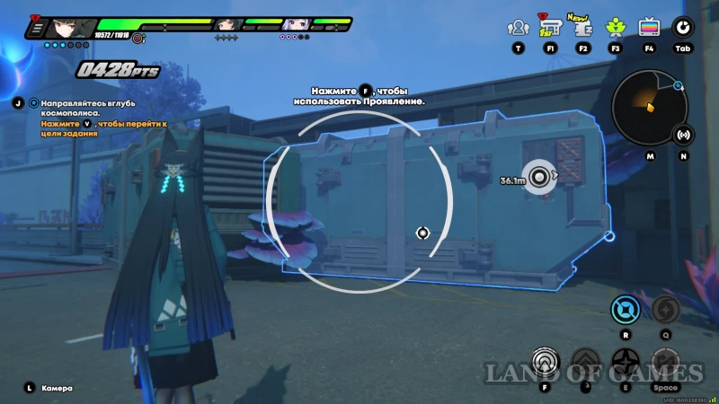 Начнем с кролика в Центральной промзоне каверны Лемнос (Высотка: запад). От телепорта «Вход в складскую зону» поднимитесь по мостовой и сразу поверните влево – перед вами будет контейнер, на котором можно использовать Проявления (техника «Отслеживания» на «R» → «F»). Пройдите сквозь голограмму и спуститесь к площадке, на которой стоит Бродячий Банбу.