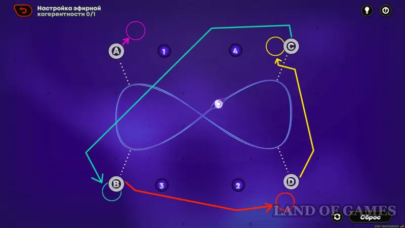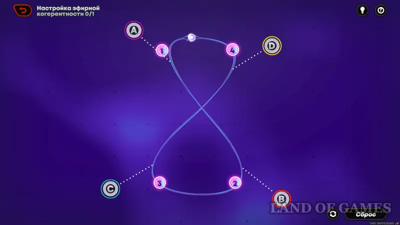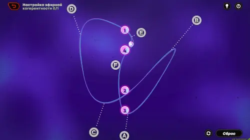 Настройка эфирной когерентности – игровой процесс с перетягиванием контрольных узлов (обозначаемых английскими буквами A, B, C, D и т.д), привязанных к замкнутой кривой линии. Задача игрока – притянуть кривую к точкам с цифрами так, чтобы циркулирующий по ней шарик зажигал их в правильной (натуральной/возрастающей) числовой последовательности.