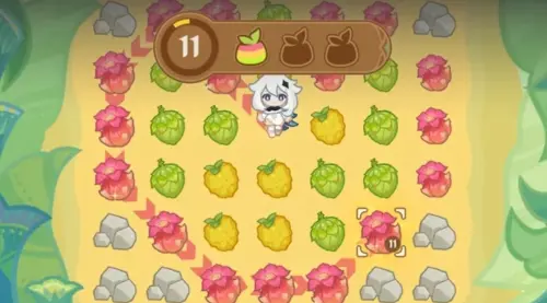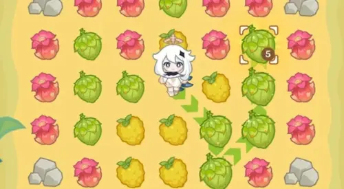В этом уникальном испытании вам предстоит прокладывать маршрут сбора фруктов, управляя перемещением Паймон, и выполнять цели уровня. Вы должны будете собирать соседние фрукты одного вида в 8 направлениях или другие доступные цели для их соединения и создания пути по сбору плодов.