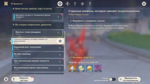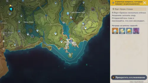 Телепортируйтесь в Порт Ормос (Сумеру) и подойдите к спорящим на улице ученым. Они будут говорить о странных испытаниях и измерении данных, а затем обратятся к Путешественнику за помощью. Они спросят, кто сильнее – плесенник или тигр. Можете дать любой ответ, так как он ни на что не влияет.