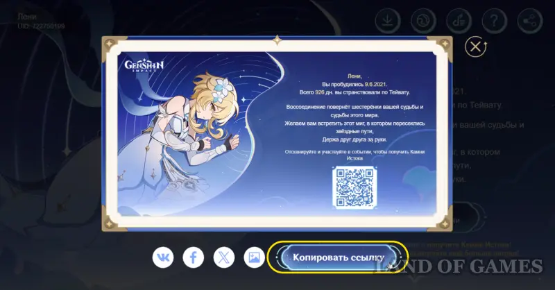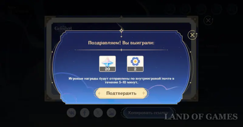 Кликните на кнопку со значком примогема «Поделиться воспоминаниями», а после выберите способ репоста (если не хотите делиться в одной из предложенных соцсетей, выбирайте «Копирование ссылки»). В награду за активность дают 20 примогемов 2 шестеренки – забираем награды, закрываем всплывающие плашки и мотаем/свайпаем страничку вниз.