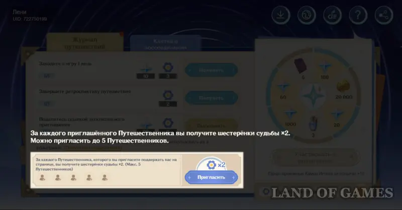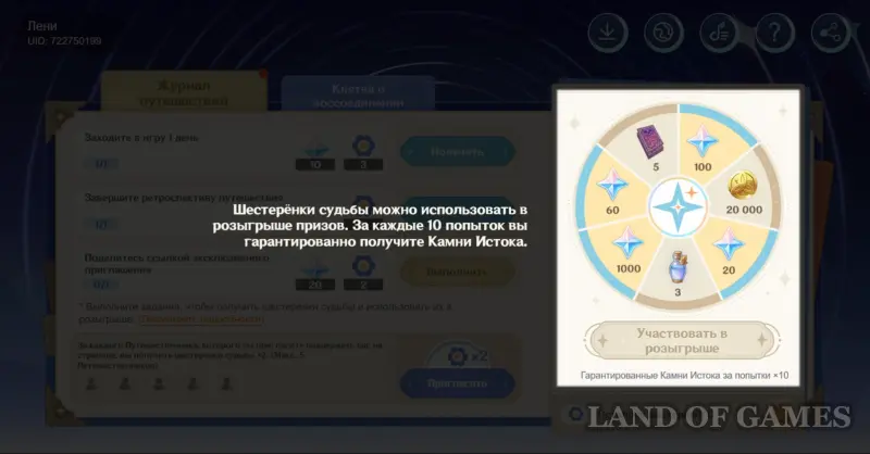 В разделе с розыгрышем есть две вкладки: «Журнал путешествий» и «Клятва о воссоединении». В журнале есть перечень задач, за которые дают примогемы и очки для прокрутов диска с призами (шестеренки судьбы). Используя клавишу «Пригласить», вы можете добавить до 5-и друзей и получить за каждого по 2 шестеренки (10 прокрутов за максимальное число приглашенных).