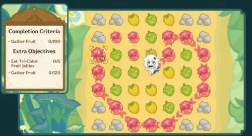 Итак, вам необходимо будет сначала выбрать Паймон в качестве отправной точки и собрать соседние фрукты одного типа. При этом основные цели уровня можно изучить в левой части экрана. Вы можете соединять фрукты по всех 8 направлениях.