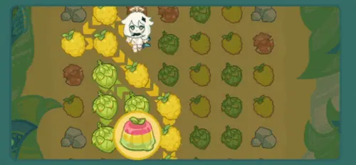 Добавим, что вы сможете также воспользоваться фруктодробилкой на данном этапе. С помощью нее можно уничтожать все фрукты в том ряду, где сейчас находится Паймон, причем эти плоды будут засчитаны в общем сборе. Так что пользуйтесь данной функцией, если вы оказались в тупике.