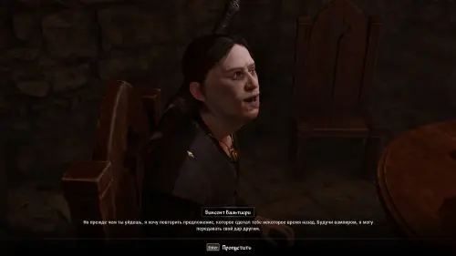 После того как вы отчитаетесь ему после выполнения последнего задания, он отправит вас к другому квестодателю, но перед этим предложит вам стать вампиром. Согласившись на это, вы начнете квест «Вечная тьма» (Darkness Eternal).