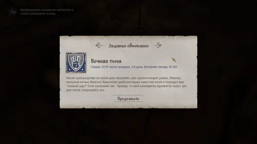 - Начать квест «Вечная тьма» Винсента Вальтиери в Темном братстве