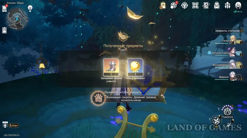 После воспроизведения мелодии появится роскошный сундучок, при открытии которого будет выдано достижение «Жужжащие секреты: Древний трезвон колокольчиков» (+5 нефритов из набора «Постичь непостижимое»). Из этого ларца вы также получите: