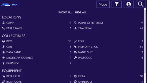 В Stellar Blade интерактивная карта заметно облегчает поиск разнообразных предметов и объектов, расположенных в разных игровых локациях. Используя ее, вам удастся узнать, где можно найти лагеря, ящики с припасами, банки, места для рыбалки, коды (пароли), костюмы и карты памяти.
