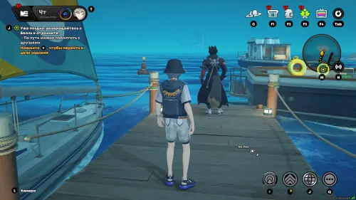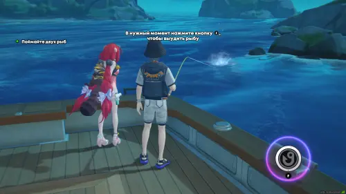Отправляйтесь к Импи и поболтайте с ним возле причала. Вы окажетесь на яхте в сопровождении Юдзухи. Примитесь за ловлю рыбы. Сам процесс не очень сложный – нужно вовремя нажимать на клавишу «F», а потом зажимать ее, чтобы вытащить рыбку из воды. На гифке ниже показано, как это делать.