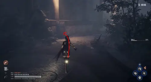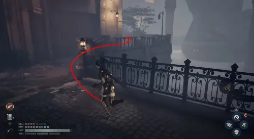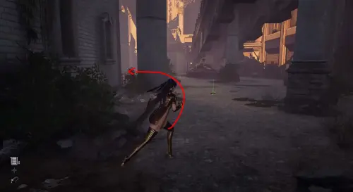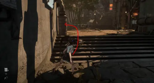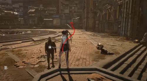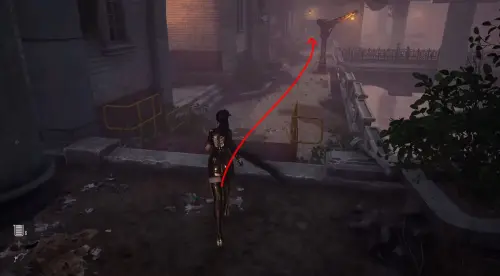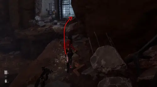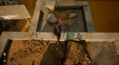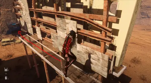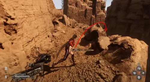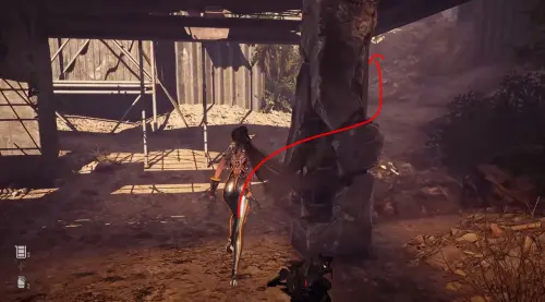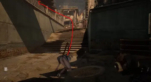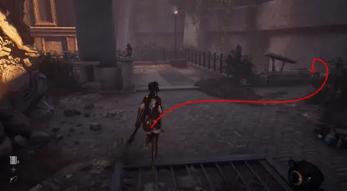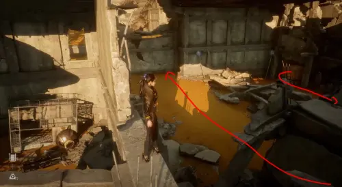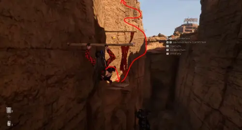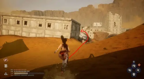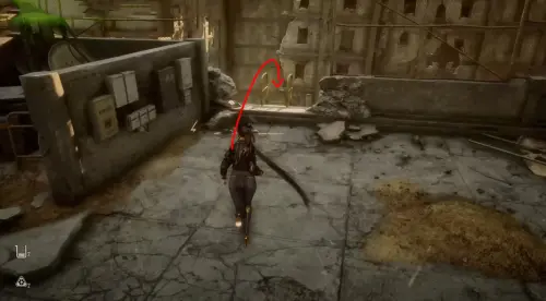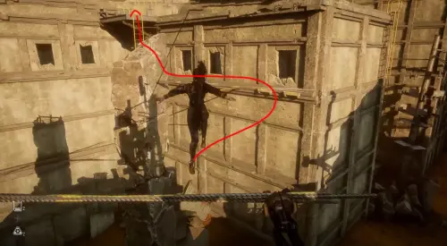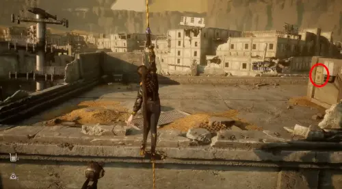 Рядом с лагерем легиона «К западу от погребенных руин» отыщите слева дыру в стене и пройдите через нее, а потом тут же сверните вправо и бегите к зданию впереди. Поверните камеру наверх, отыщите мишень и выстрелите в нее, чтобы сбросить веревку и забраться по ней на крышу постройки.