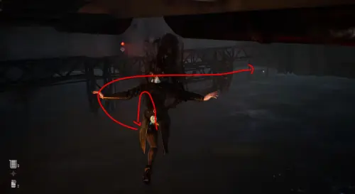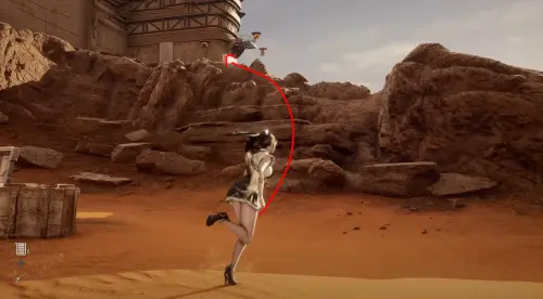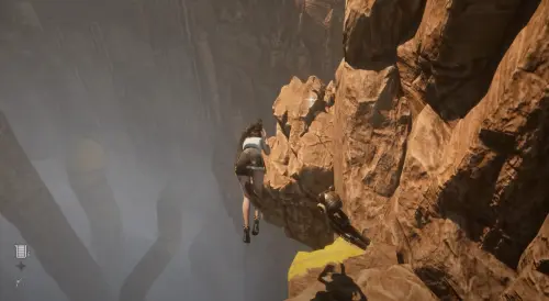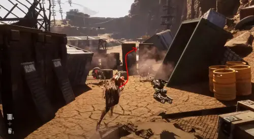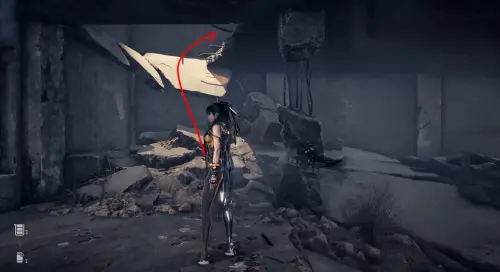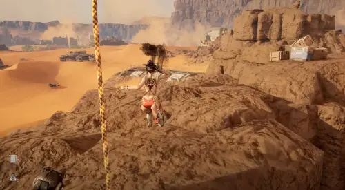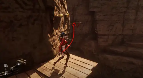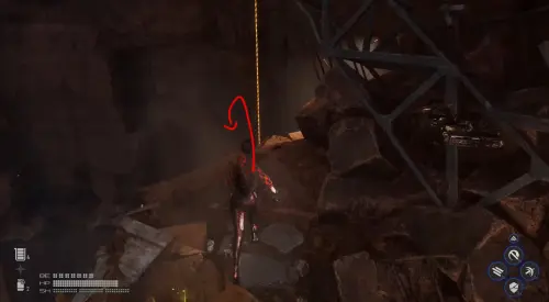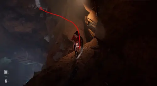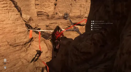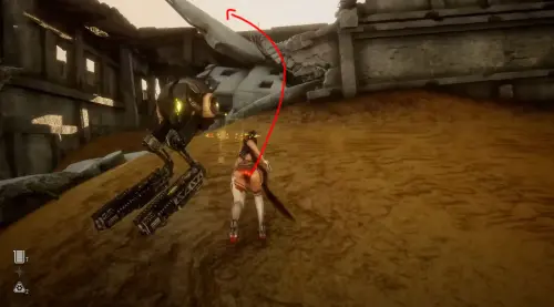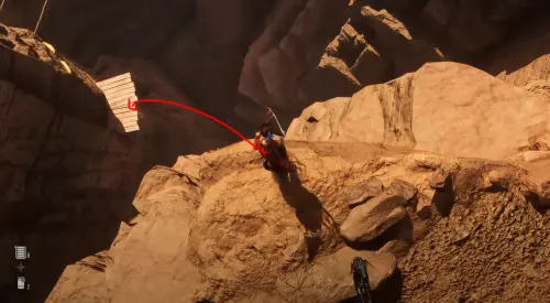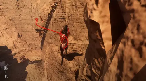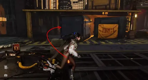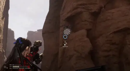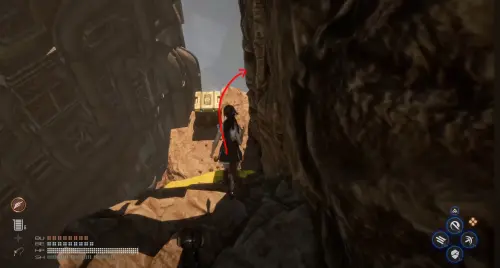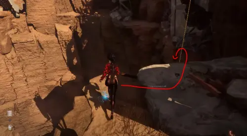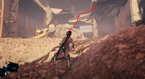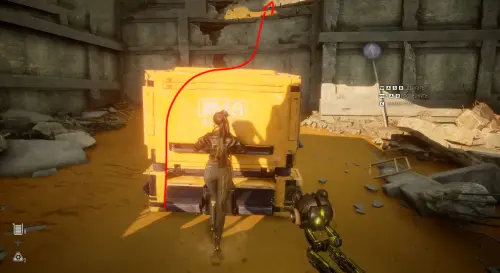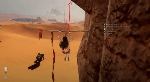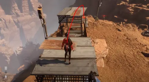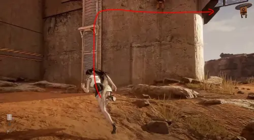 Поднимитесь по желтым выступам, после чего выстрелите в дрона с мишенью для сброса веревки. Залезьте наверх и доберитесь до сундука.