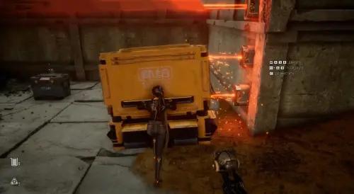 Отыщите место с лазерами. Недалеко от него есть огромный контейнер. Перетащите его и заблокируйте им лазерные лучи. Преодолейте препятствие и возьмите напиток.