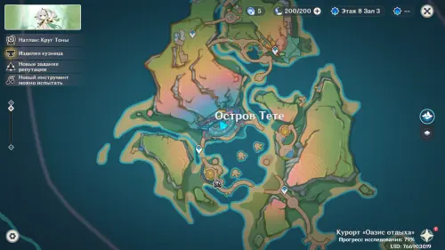 Призыв двух домов – Откройте следующую область Натлана: курорт «Оазис отдыха». Откройте карту и двигайте указатель налево и вверх от материковой части Натлана, чтобы увидеть неоткрытую область и статую Пиро Архонта. Приблизьте масштаб, и вы заметите здесь уже открытый телепорт – переместитесь к нему. Далее взаимодействуйте со статуей, расположенной дальше на севере.
