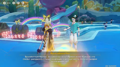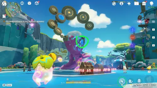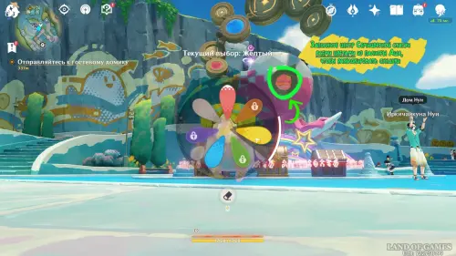 Оказавшись на курорте «Оазис отдыха», двигайтесь на северо-запад, пока не дойдете до небольшого поселения под названием Беззаботная ярмарка. В ее центре вы обнаружите Семицветную статую, рядом с которой стоят три заблокированных сундука. Затем пообщайтесь с Иркичайкуном Нуи, стоящим неподалеку. Паренек расскажет вам, что для получения награды нужно раскрасить обелиск в разные цвета.