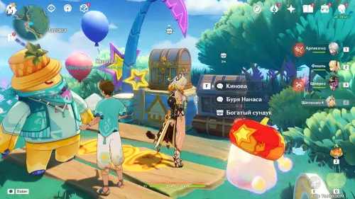 Когда окажетесь на курорте «Оазис отдыха», отправляйтесь на северо-запад от находящейся здесь статуи Пиро Архонта и заберитесь на верхушку утеса. Здесь вы обнаружите группу людей, столпившуюся рядом с деревянной площадкой, на которой стоят сундучки. Подойдите к Кинове и согласитесь поучаствовать в состязании, чтобы начать первое испытание.