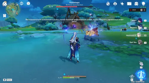 В течение боя противник редко совершает удары, однако его атаки могут снести большую часть ХП вашего героя или даже ваншотнуть его. Следите за движениями босса: когда тот начинает качать головой, через пару секунд будет совершен удар. Первую атаку Капибара выполнит почти сразу же, поэтому старайтесь отойти и зайти ей за спину после применения элементальных навыков.