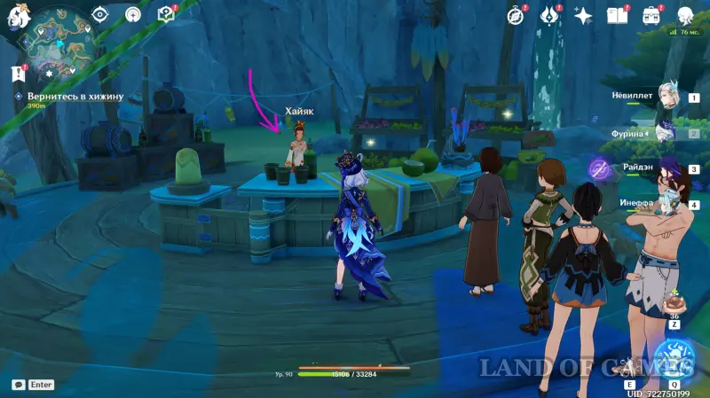 Переместитесь к огромной статуе кохолазавра в Заливе Прибоя, а затем пройдите по причалу на юг — в указанном месте выстроилась очередь желающих заказать напиток у Хайяк.