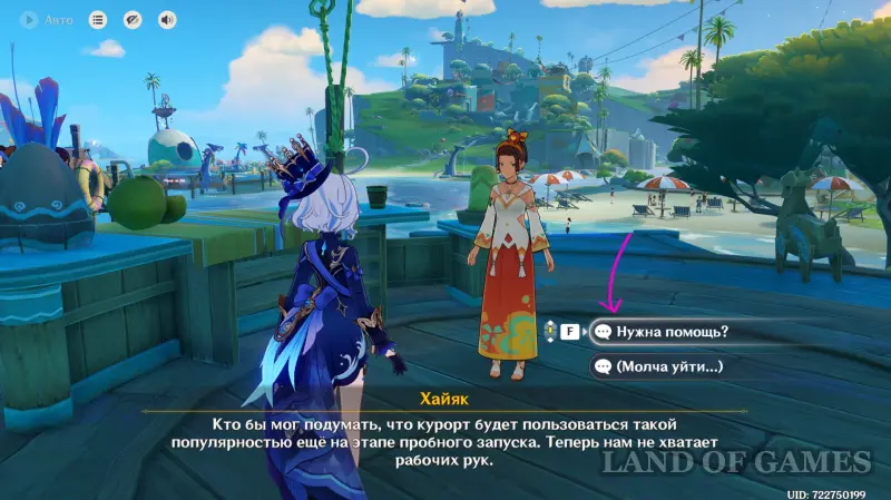 Начните разговор с девушкой с красным ободком и поинтересуйтесь: «Нужна помощь?». Хайяк с удовольствием согласится и попросит вовремя отнести напиток гостю, упомянув, что он в синих штанах на пляже.
