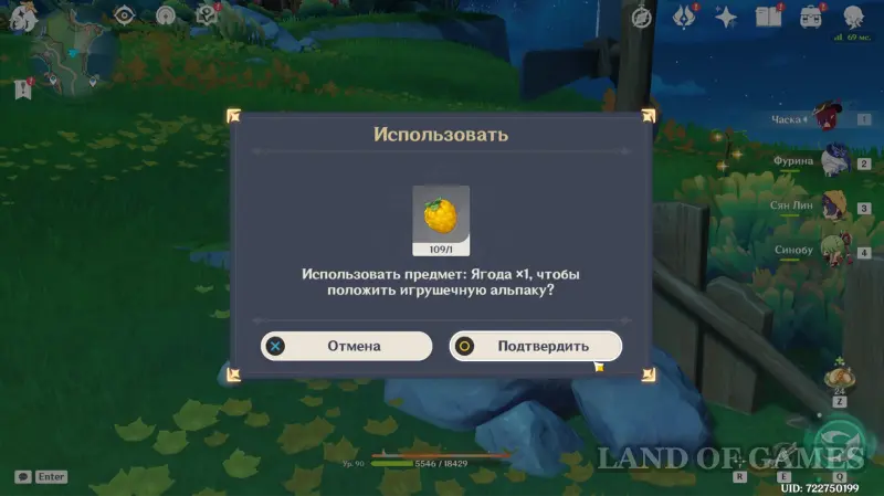 Напиток исчезнет, а на ламе появится стрелочка — разместите сверху одну Ягоду (если ресурса не хватает, сорвите его с куста, растущего чуть правее). Благодарная лама начнет перебирать перед собой разные объекты, и в конечном итоге создаст монумент испытания.