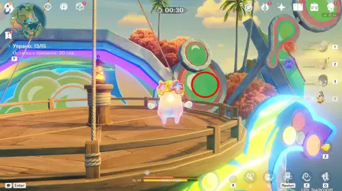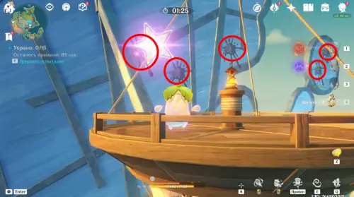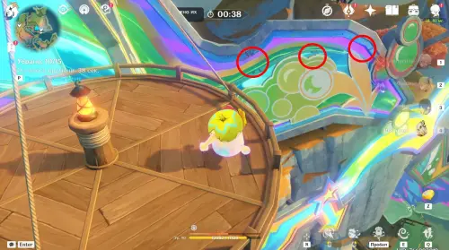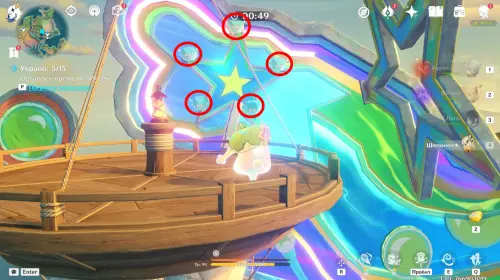 Притянитесь к звездочке, чтобы запрыгнуть на воздушный шар, а затем удалите первые 5 грязевых пятен с задней части полотна, выстрелив в них невидимой краской (ЛКМ). Подождите, пока вы не окажетесь перед передней частью вывески, а потом уничтожьте 5 Анемо слаймов, расположившихся на концах звезды.