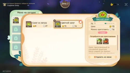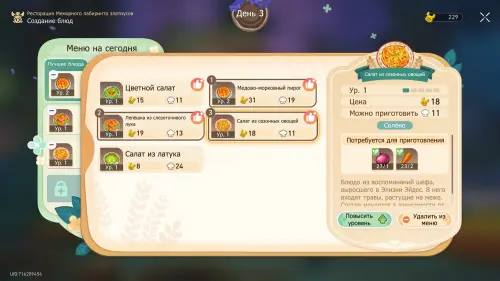 Наступит следующий день, во время которого вам предстоит придумать название ресторана – выберите любой понравившийся вам вариант. В результате вы разблокируете ачивку «Если Первопроходец, значит, прекрасная кухня!». Далее соберите урожай и создайте Цветной салат, перейдя в раздел «Создание блюд». Добавьте его в меню, убрав перед этим Салат из латука.
