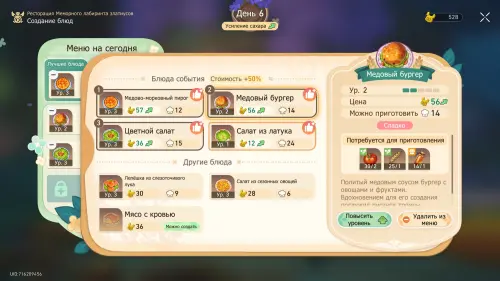 На 6-й день начнет действовать бонус «Усиление сахара». Цифер также откроет магазин в Меморном лабиринте, где вы сможете приобрести редкие ингредиенты, которые не выращиваются на ферме. Обязательно купите побольше меда. Далее создайте Медовый бургер и повысьте его уровень. Добавьте его и Цветной салат в ваше меню.